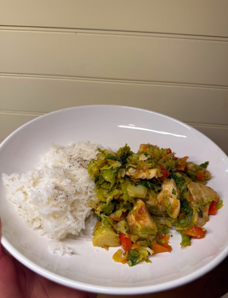 In another pan, cook your cubed chicken in some olive oil and season accordingly. Once your vegetables re tender and your chicken is cooked, add the cooked chicken to the vegetables and add your grated garlic, ginger, diced tomatoes, and toasted sesame oil. cook for about 5 minutes. Serve with rice and soy sauce if desired, enjoy!