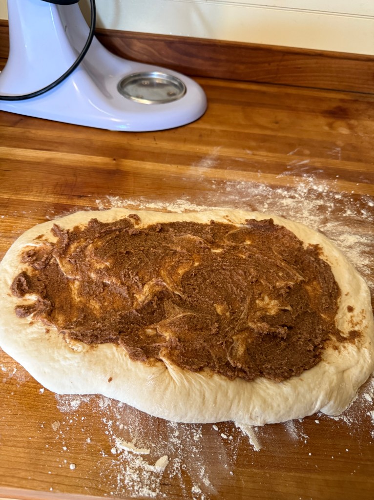 6. After the dough doubles, transfer it to a floured surface and press it into an oval/rectangle about the same width as the loaf pan. Spread the cinnamon filling with your fingers, and avoid the filling touching the edges- leave it about 1/4-1/2 inch from the edge. Roll the dough tightly, pinching the seams well and tucking the edges. Place in a prepared baking pan. I like to press down on it gently but firmly to distribute it into the pan. Cover and let rise for about an hour or until the dough has risen an inch above the top of the baking pan.