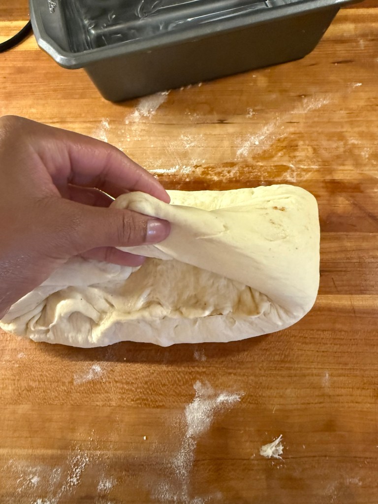After dough doubles in size, transfer dough to a floured surface and press into an oval/rectangle about the same width as the loaf pan. Roll dough up tightly and place in prepared baking pan. I like to press down on it gently but firmly to distribute it into the pan. Cover and let rise for about an hour or until the dough has risen an inch above the top of the baking pan. Preheat oven to 375 degrees F while the dough rises.